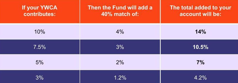 Your YWCA association makes a monthly contribution to your retirement account based on your compensation. That contribution then accrues interest provided by the Fund, calculated annually using the average of 10-year Treasury securities for the month of October in the preceding year.