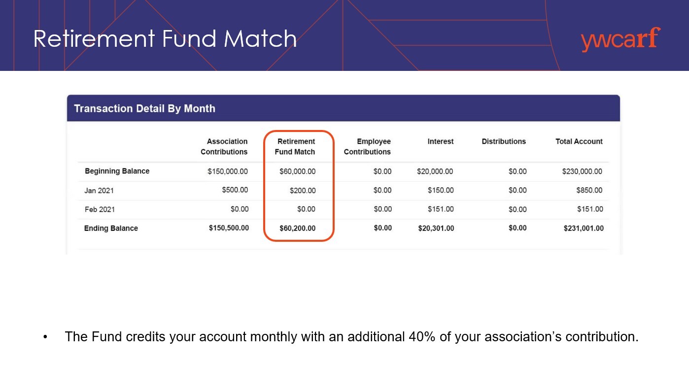 We match 40% of your YWCA association's monthly retirement credit. Here's how it works.
